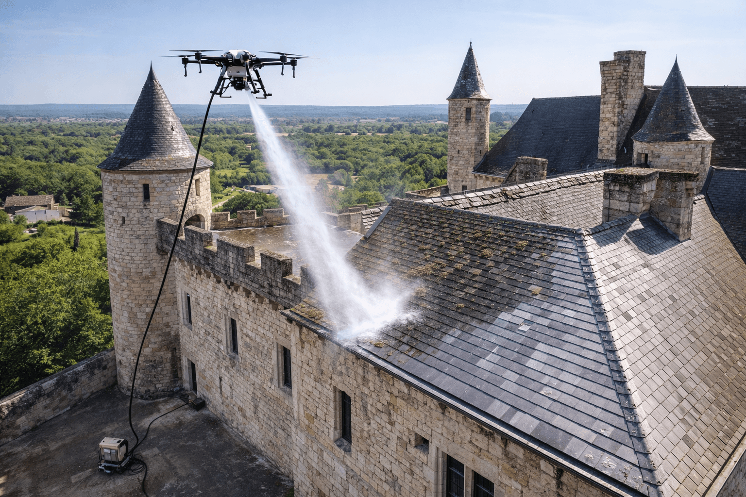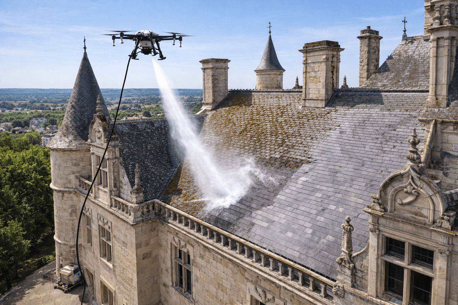 Nettoyage de toiture de châteaux par drone : élimination des mousses, lichens et salissures sur tuiles, ardoises et couvertures anciennes sans échafaudage, avec des techniques respectueuses du patrimoine.
