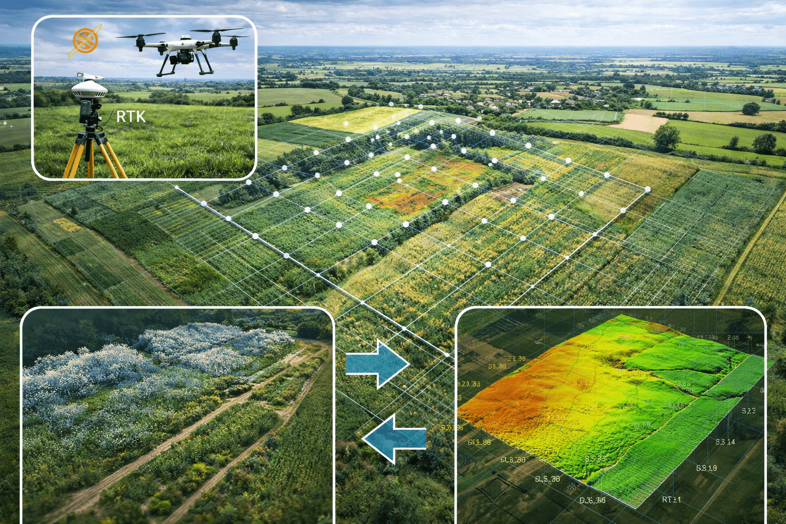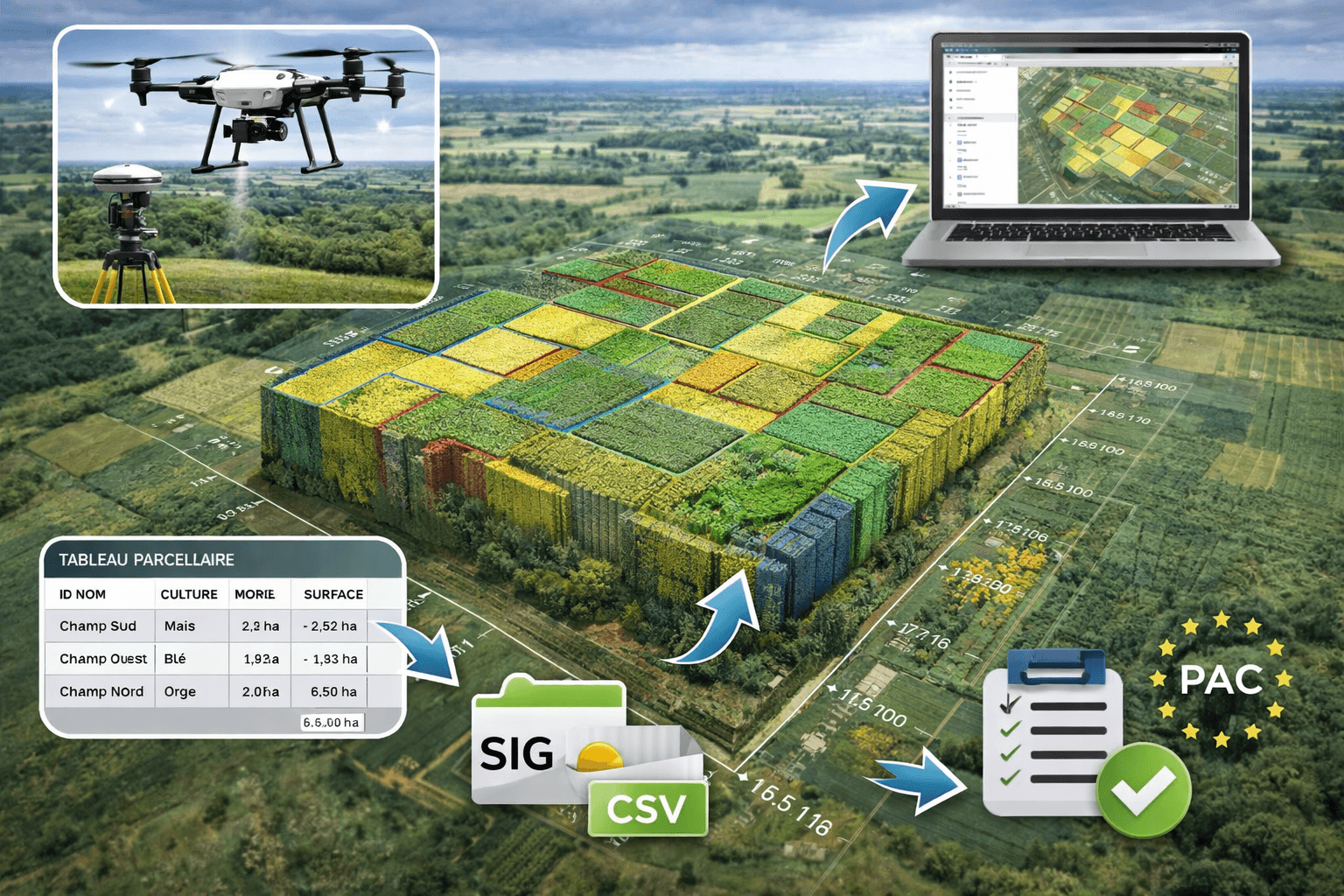Orthophotographie par drone avec photogrammétrie et géoréférencement RTK : cartographie parcellaire, mesure précise des surfaces agricoles et export SIG pour exploitation et déclarations PAC.