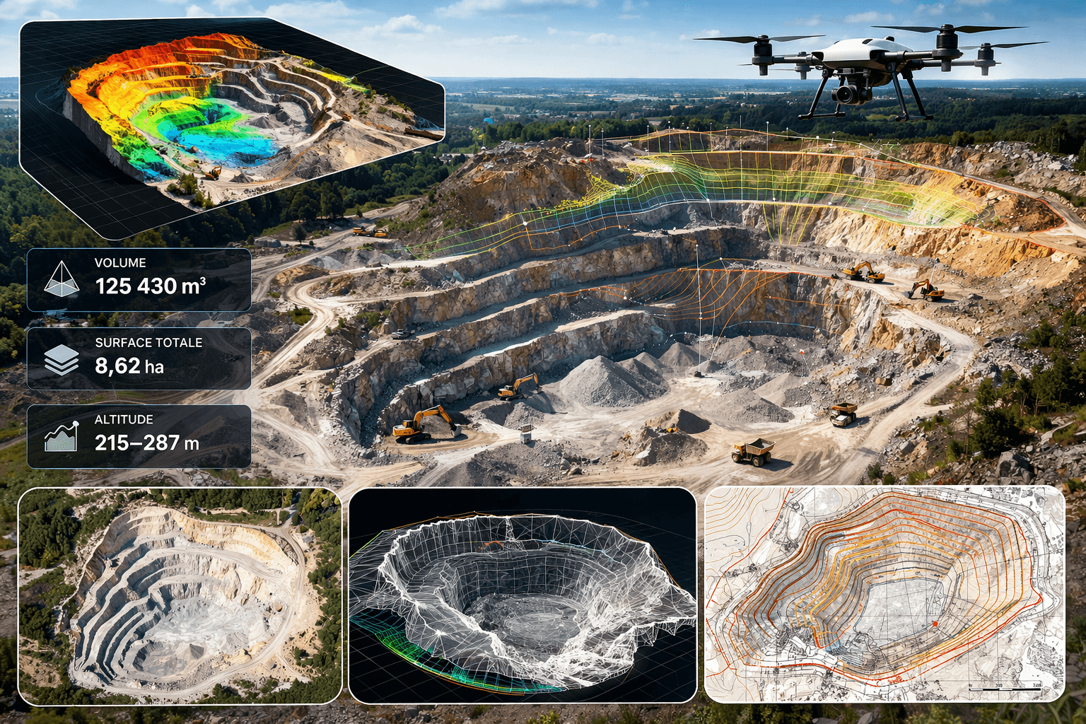 Dans les carrières et sites d’extraction, le suivi des volumes, des stocks et de l’avancement est essentiel. Les méthodes traditionnelles (topographie terrain, GPS manuel) sont longues, coûteuses et parfois imprécises.