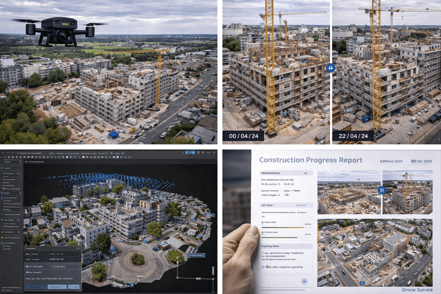 Prises de vue répétées avec les mêmes angles pour comparer l’avancement semaine après semaine ou mois après mois.
