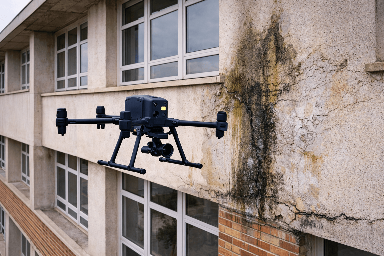 Les infiltrations d’eau en façade de bâtiment public peuvent provoquer des dégradations importantes : humidité intérieure, moisissures, décollement des enduits ou détérioration des structures. Ces infiltrations sont souvent difficiles à localiser précisément sans inspection en hauteur.