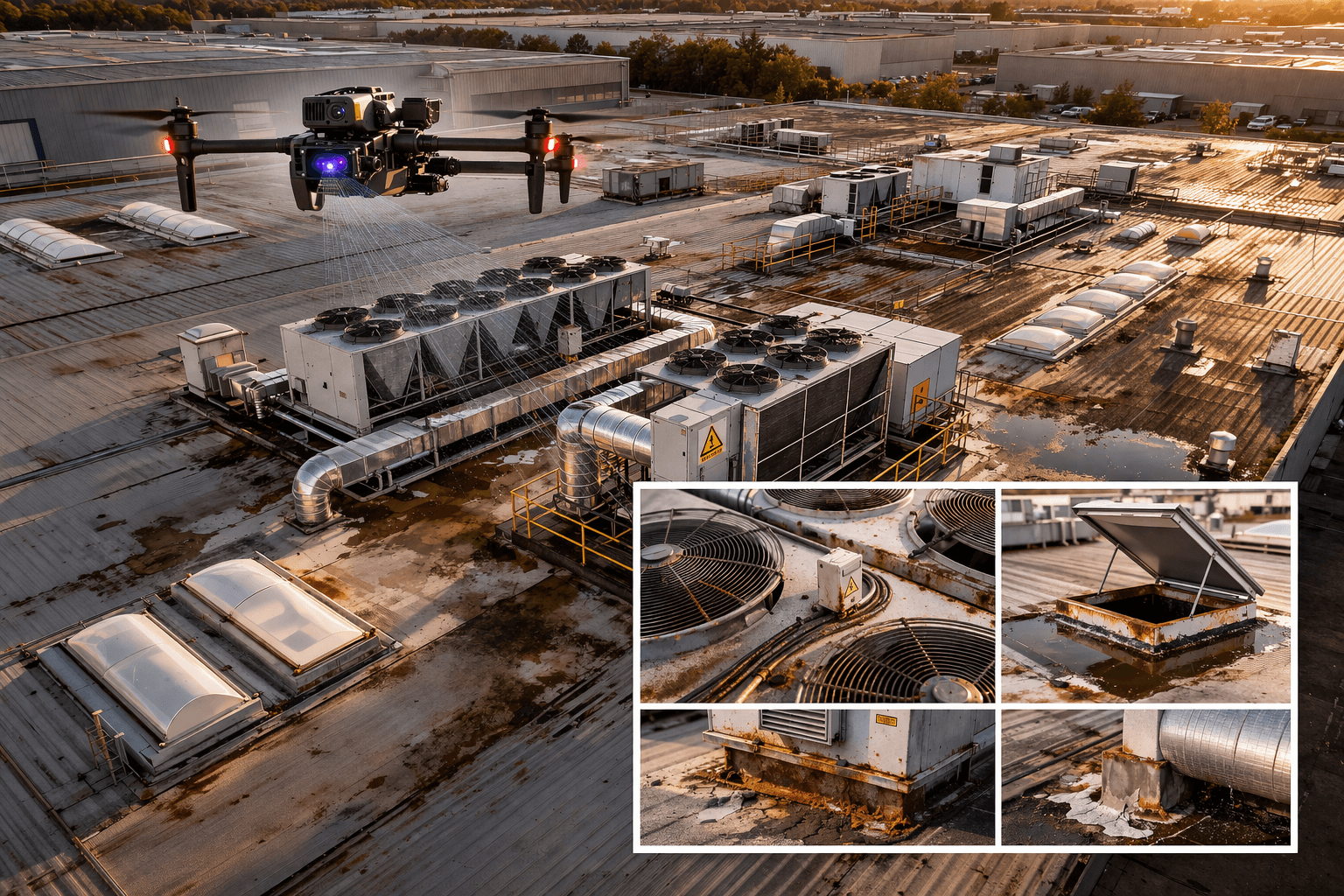 Inspection des équipements de toiture industrielle par drone : lanterneaux, HVAC, groupes froid, exutoires et installations techniques. Détection des défauts, corrosion et problèmes d’étanchéité sans nacelle ni arrêt de production.