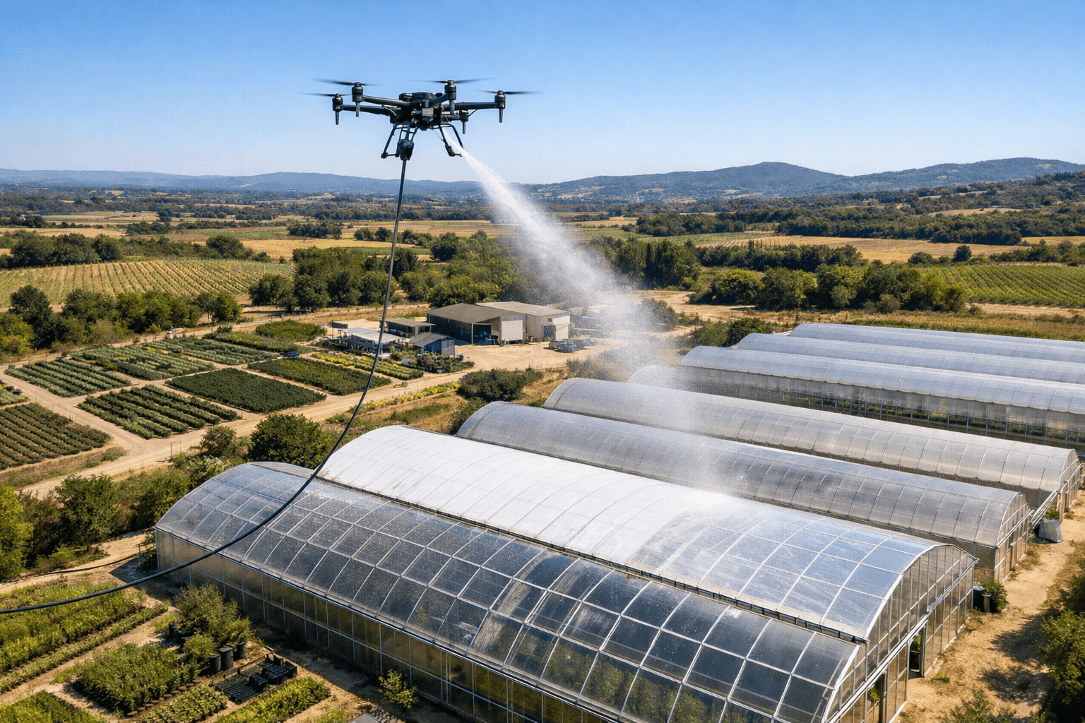 Pulvérisation uniforme sur les serres.