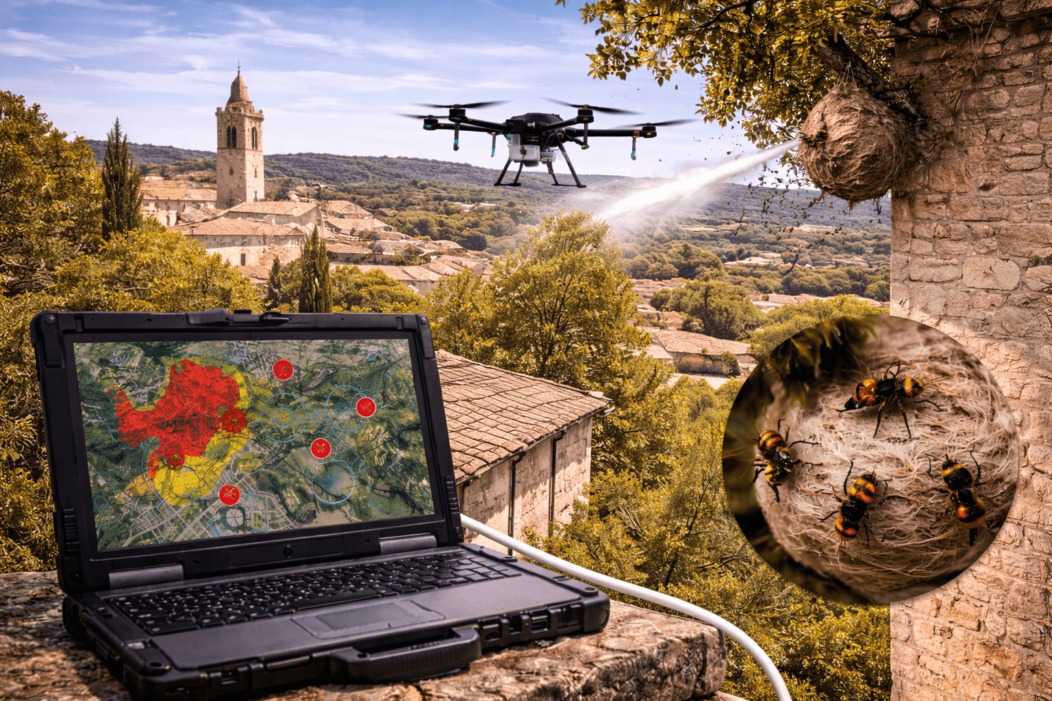 Le drone permet d’identifier et de neutraliser les nids de frelons asiatiques en hauteur sans intervention dangereuse.
