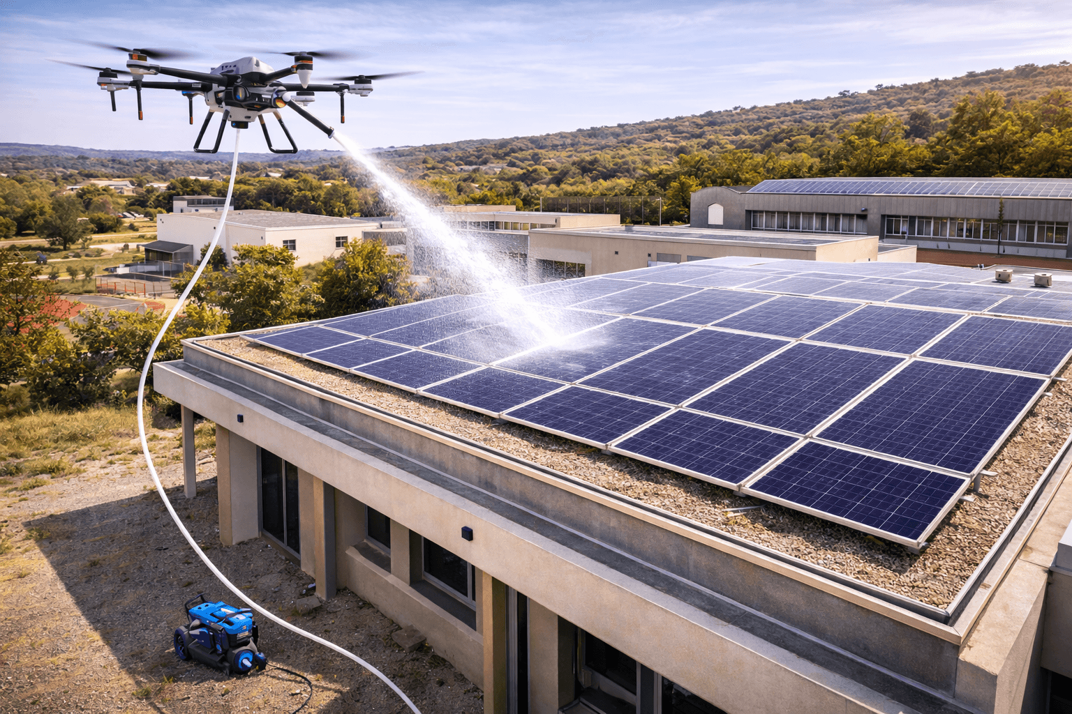 Le nettoyage par drone permet de nettoyer rapidement les installations photovoltaïques installées sur les bâtiments publics sans accès direct à la toiture.