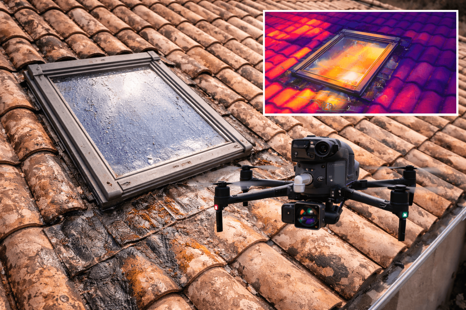 Le drone capture des images détaillées de la toiture et des zones sensibles.